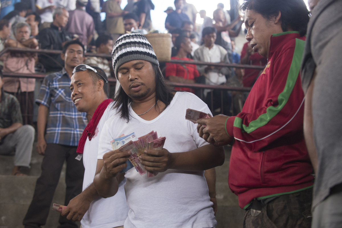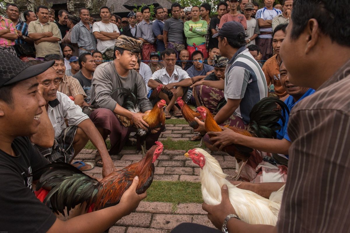 Gamblers call out their wagers, seeking partners to accept bets. In the past, cockfights were illegal in Bali, but because of their cultural importance the ban was ignored. The compromise between Balinese authorities and the central government was to allow the fights but ban gambling, as it is frowned upon by the Islamic values that are prevalent in the central government.