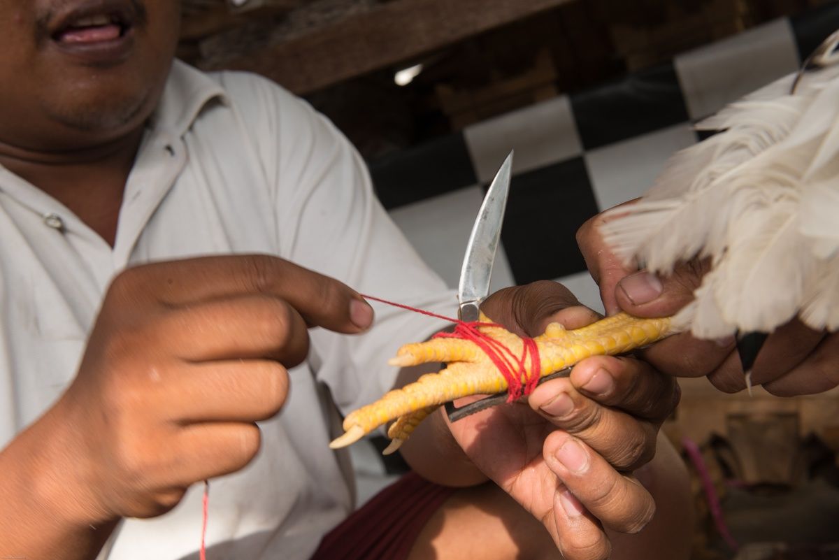 The Balinese tradition of tying steel blades to the feet of cocks for fights is different from other Indonesian islands, where the animals simply peck each other until one is exhausted.