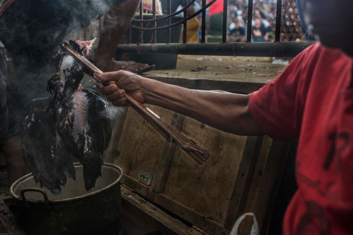 As soon at the match ends, the birds are plucked and prepared to cook at a later time.
