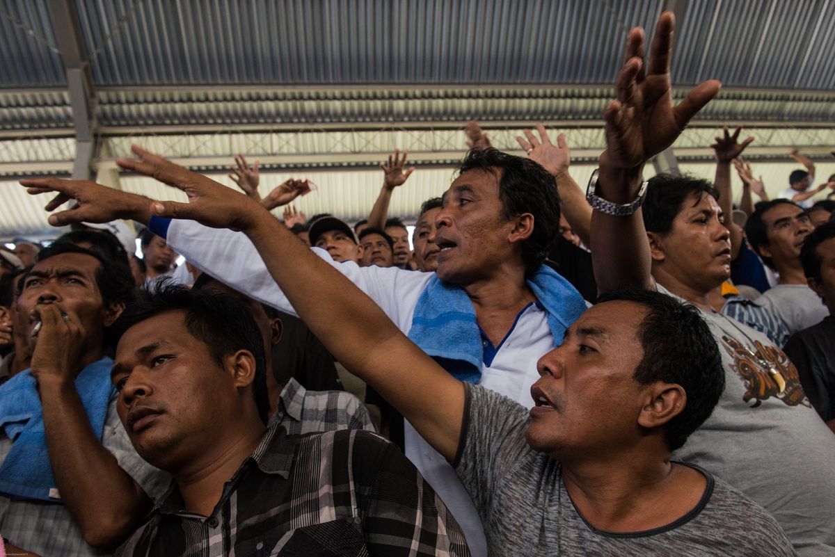 Balinese men look on as two birds begin a fight to the death near Ubud, Indonesia. It is a requirement for each temple on the island to host a cockfight every year.
