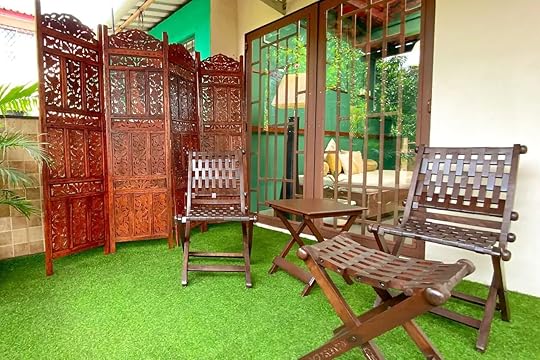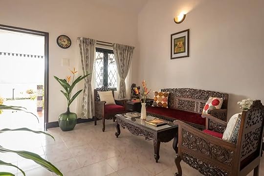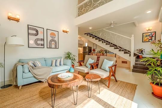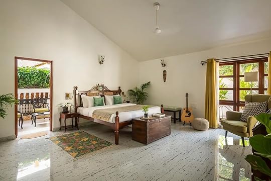 See more photosThis bright, bohemian-designed villa is filled with sunlight and was built to balance the interior and exterior to create a shared space to enjoy. It’s located in, Siolim feeling central to the beaches. It’s a peaceful and luxurious home — tastefully decorated in the common spaces with shades of soft blues, muted whites, and light wooden tones. The table furniture, made from reclaimed tree trunks, feels like bringing the outdoors inside. In the bedrooms, the natural design trend continues, with plenty of plants and luminous colors. There’s even a shared outdoor pool that’s open year-round.