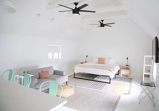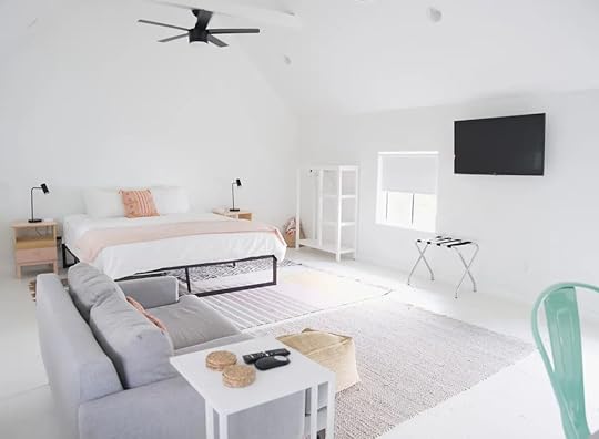 This stunning Airbnb Nashville property is another relaxing and inviting property in the heart of the Five Points area. This remodeled 1928 guesthouse features an all-white sleek interior and theme with a pop of color splashed throughout the home. The suite features an open floor plan with a kitchen area and a bright and airy living room area with doors that lead to the outdoor common area with a pool.
