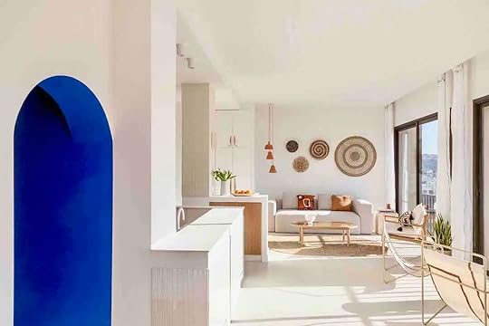 This huge loft occupies prime real estate and sleeps up to eight people. There are four double bedrooms and two bathrooms (one with a tub.) The rooms are minimalistic with clean white walls accented by blue-painted timber beams and shutters. The color pallet is continued throughout the property with delightful houseplants adding accents of greenery against the light-drenched space.