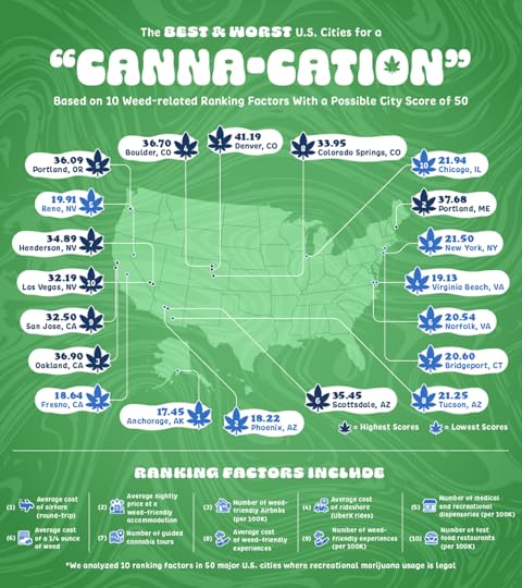 The 10 best cities for a cannabis vacationDenver, ColoradoPortland, MaineOakland, CaliforniaBoulder ColoradoPortland OregonScottsdale, ArizonaHenderson, NevadaColorado Springs, ColoradoSan Jose, CaliforniaLas Vegas, NevadaTo find the best cities for a cannabis vacation, Upgraded points looked at50 of the largest cities in states where recreational marijuana usage is legal. The cities were then ranked on a scale from one to five in 10 categories: average Cost of round trip airfare, the average nightly price at weed-friendly accommodations, number of weed-friendly Airbnbs, the average cost of rideshare, number of dispensaries, the average cost for a quarter-ounce of weed, number of guided cannabis tours, the average price of weed-friendly experiences on Eventbrite, and the number of available fast food restaurants. These scores were then rated according to their impact on cannabis tourism. Each city then received a final score on a scale of one to 50.