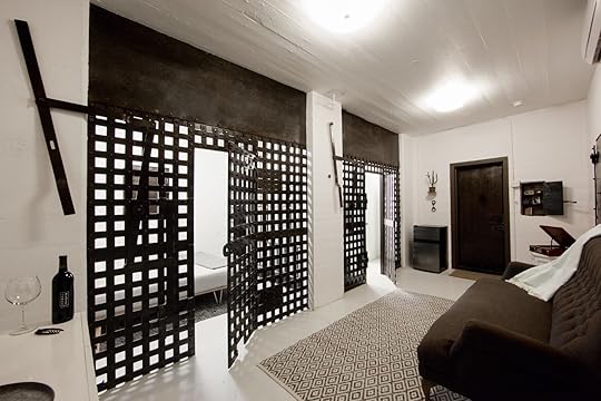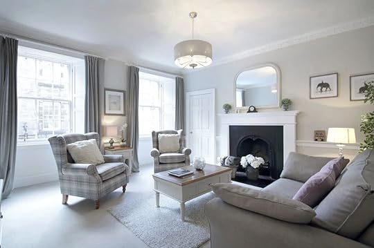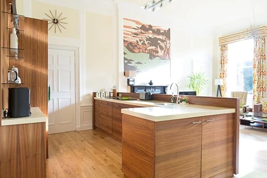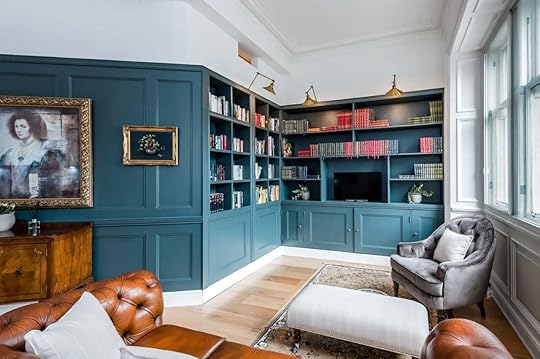 Indulge in this updated Airbnb in Edinburgh’s Old Town with classic vintage charm. The unit has full panel walls with dark grey colors and bright wood finishes, as well as many antique charms. There is a spacious living room with a vintage bookcase with a secret door leading to the main suite, a full kitchen, and a small dining area.
