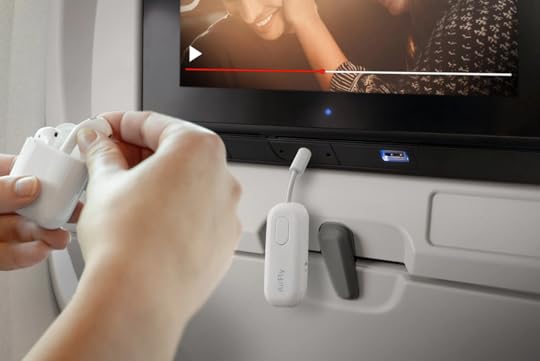 So I was thrilled when I learned about the TwelveSouth AirFly Pro — a tiny, ultralight Bluetooth adapter that plugs into the headrest TV screens. It pairs with all wireless headphones, allowing users to watch airline TV screens with their own personal headphones.