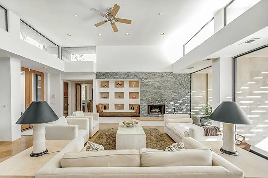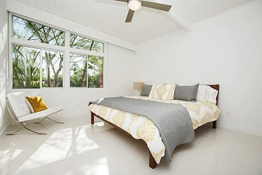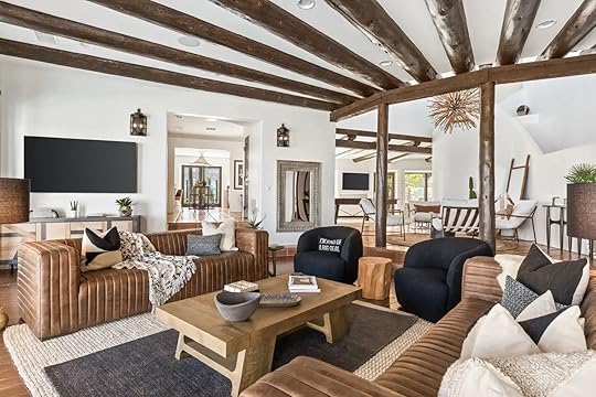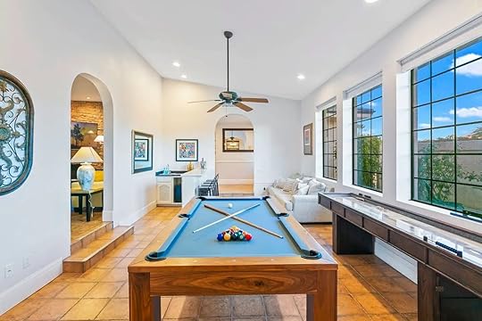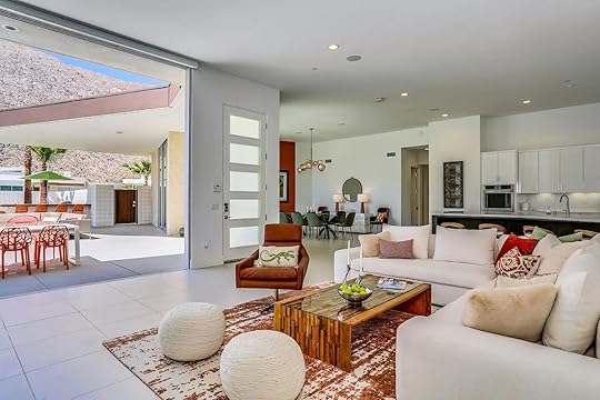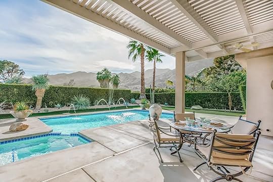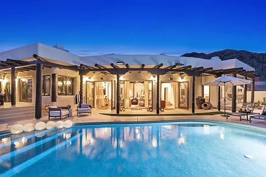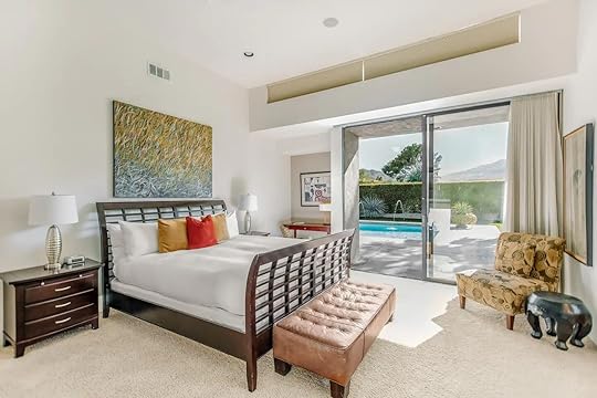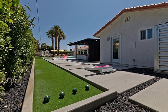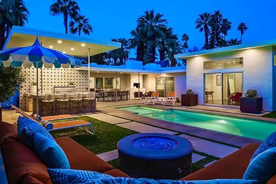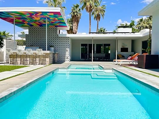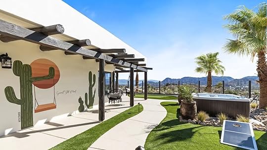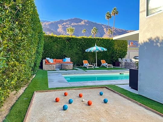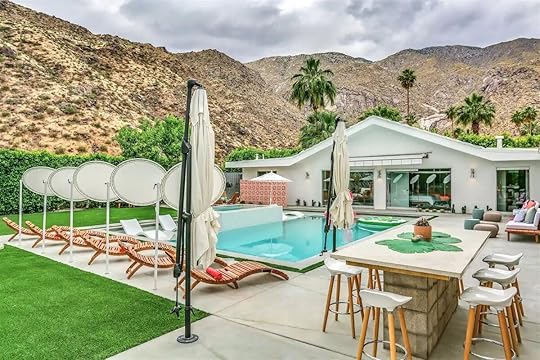 This luxury Palm Springs Airbnb is literally surrounded by towering palms and the San Jacinto Mountains standing guard from farther away. The home is bright and airy, with post-worthy bedroom palm views. But this spot is all about staying active and engaged (pun intended). Games are the name of the game here. There’s a giant putting grreen set up, corn hole, ping pong table, and more on-site to keep the crew laughing. And there’s a pool surrounded by shaded cabanas for when cocktail-and-chill time kicks in.