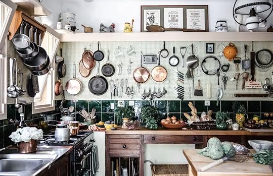 La Peetch has three bedrooms, a sitting room, and gardens with a terrace and swimming pool. The most important part of the cottage, of course, is the kitchen, with wooden countertops, a pegboard pot, and utensil storage painted with the outlines of the original cooking implements used by Julia.