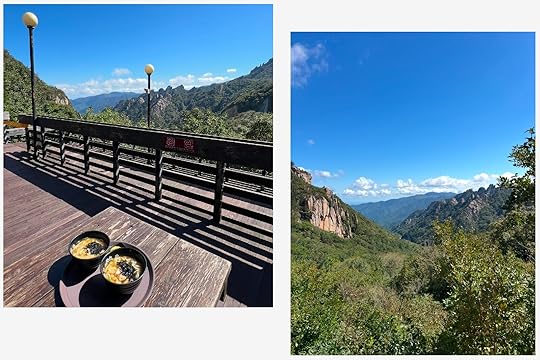 Saved by the service station. Not the regular type. This service station sits at the highest point of the route at 5,177 feet elevation. Inside a large and old wooden cabin, the staff served traditional Korean date teas and traditional mountain foods like acorn salad, pollack soup, and savory potato pancakes. The old cabin architecture with stone-paved floors gave it a cozy feeling — perfect to sit and rest, and congratulate yourself for making it up the mountain. It felt like such a relief to arrive and I really needed that rest. Body filled with what felt like a mixture of adrenaline and cortisol, we ordered tofu skin udon soup and hot date tea, then grabbed a table outside to enjoy the mountain view we worked so hard for. It was an unrivaled view compared to anywhere else I’ve eaten at in my lifetime, and will perhaps forever remain unrivaled. For that reason, and being among the fresh mountain air and partially traumatized, the food also tasted that much more delicious.