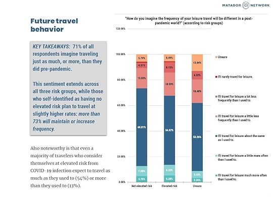 Even travelers with an elevated risk of infection are planning a speedy return to adventure. Sixty-seven percent of travelers surveyed who consider themselves at elevated risk from COVID-19 said they would travel for leisure at the same rate, or even more, than they used to. This is only a slight decrease from non-elevated risk respondents, 71 percent of whom said they would return to their previous travel habits, or travel even more frequently.