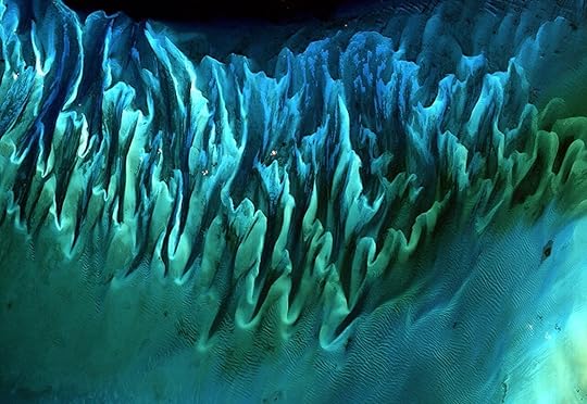 “Ocean Sand, Bahamas,” taken in 2001 by Serge Andrefouet through the Enhanced Thematic Mapper Plus instrument aboard the Landsat 7 satellite, is a beautiful artistic false-color rendering of patterns in the sands and seaweed in the Bahamas.