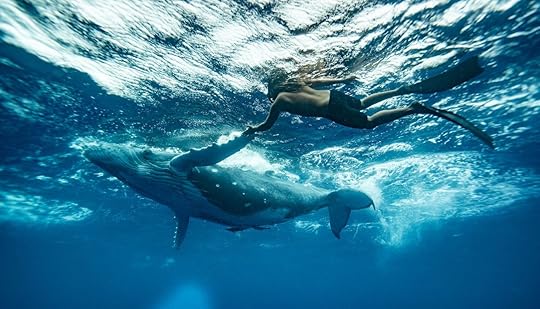 Once beneath the surface, I gaze down into the blue abyss below me, no bottom in sight. I fight the waves and swim closer to Tao, feeling my excitement growing and my breath quickening as I search the deep shadows below me. Then, something massive looms up out of the blue — a humpback whale.