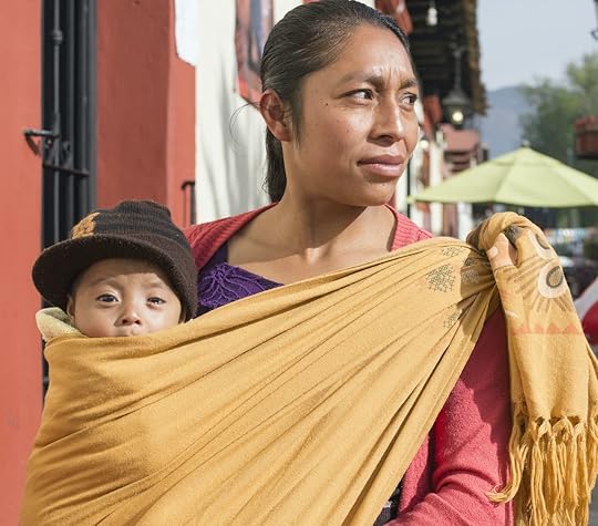 Throughout Mexico, rural weavers and other craftswomen wear babies in a rebozo, a long, narrow rectangle of fabric that indigenous Mexican women use to attach their kids to their hips or front of the body. It’s usually woven from cotton on a backstrap loom.