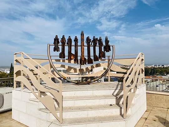 This menorah was made with rockets in the town of Sderot. Sderot is located less than one mile from the Gaza Strip and has been the target of attacks from Hamas. For that reason, the town is full of bomb shelters, as well as artworks made with the rockets destined to damage it.