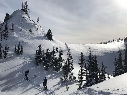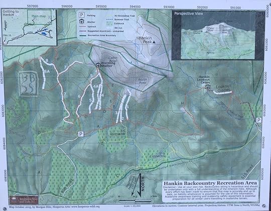 An uptrack is established from the parking area to a day-hut just below the treeline. The ascent on skins is steep at points but frequent switchbacks ease the burden. The hut awaits about 1.5 hours up the trail, a solid place to recoup over a snack while looking at conditions to decide how much further to ascend and, ultimately, which runs to lap. If conditions allow, an additional 20-minute push up from the lodge takes you about halfway up the Hankin Peak bowl, the summit of which is generally not safe to ride until late March at the earliest. The best out-run to avoid a wicked traverse is Run 4A down from the hut at the end of the day. There is an old fire cabin that rents out overnight for a moderate fee. Beyond that, the entirety of Hankin Evelyn is free to access.