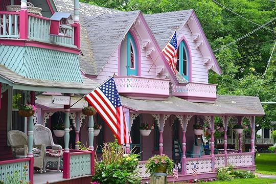 Arriving in Oak Bluffs felt like stepping into a fairy tale. The 26-square-mile town consists mostly of Victorian-era homes that look like gingerbread houses painted in psychedelic colors — bubble gum pink, aquamarine, lavender, mint, and lime green. Intricate latticework decorates the quaint wrap-around porches and the eaves of the roofs.
