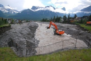 On Thursday morning many of us in Canmore woke up to learn how real that axiom really is as Cougar Creek, dry for 50 weeks of the year, and usually contained between its engineered banks of trap-rock and fill, had carved a new course through the residential community that bares its name. The creek, ten feet wide during a normal spring, surged to more than two hundred feet wide, carving a wide swath through its historic alluvial fan, and tearing away at people’s back yards, sheds, fences, and eventually foundations. That no homes toppled into the creek is a miracle.