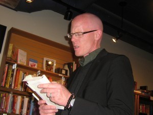 I love reading to my friends, and so it was in Canmore last night. My thanks go out to new friends and old for your attendance at Cafe Books last night for another book event in the Bow Valley. Cafe Books has hosted events for my last four novels and as always they made me feel very welcome, with wine and kind words. Thanks to those who stocked up on books – at least two folks went home with four books each! Below is a photo of me getting into character; the photo was taken by another character, my ten-year-old son Rio. Thanks again to all for a very nice evening.