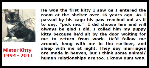 A listener emailed to tell me about the loss of her beloved pet after 16 1/2 years of companionship. Here's her tribute to Mister Kitty.