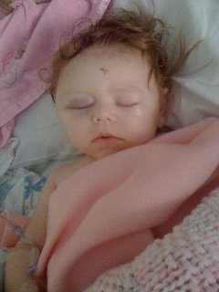 She's moving her left side with same mobility as before the surgery, which is great. It's the side most effected by the disconnection of her right brain. Her head and faced swelled tremendously following surgery, (giving her a black eye) but it's gone down enough for her to open both of her eyes. Most of the week, she's seemed to be in pain (she rarely cries, but just acts agitated) and that seems to be improving as she's started to smile a little and play with her blanket and favorite bear. She was sleeping almost non-stop and was generally lethargic, but that's started to improve.