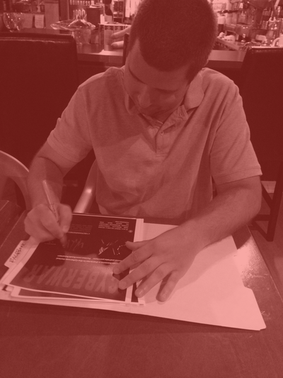 “Fill out the pad, sir,” she said before he could complete his sentence. He reluctantly bent and wrote sloppily on the screen with a pen that was tied to the counter and did not allow his long arms to lift it far enough to be comfortable writing in the lines.