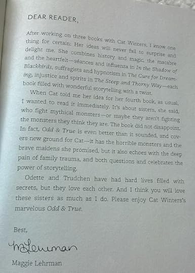 I'm currently running an international Twitter giveaway for an advance reading copy (ARC) of Odd & True. To enter, follow me on Twitter ( @catwinters ) and retweet this tweet about the giveaway. Ends midnight of April 30, 2017.