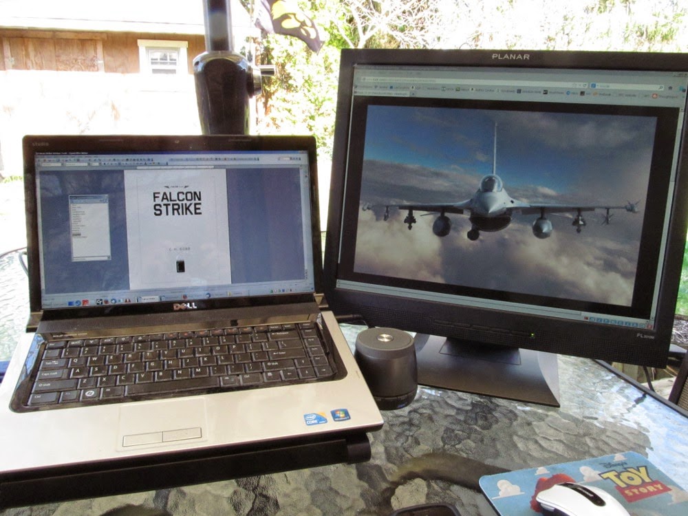 Okay, I'm back. If you look closely, you can see what I'm working on. Displayed on the monitor at the right is an advance peek at what will probably be the cover shot of Falcon Strike . My cover lady/book consultant extraordinaire (Dani Snell, aka my daughter) nixed all my other picks. She loves this one. It's from the prolific lens of Kris Klop and is a good sample of his aviation art. You really ought to check out his stuff at Clearskyphotography.com. Kris, reckon I'll be contacting you soon to purchase the rights to use this shot. He's the photographer for all of the gorgeous covers on the Falcon Series. Between his and Dani's work, I am very blessed.