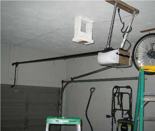 Got my box home, and staggered into the garage with it (okay, it's only 40 pounds, but I have not done my P90X since this summer; give me a break). Set it down, looked up, and there was my old (broken) garage door opener staring back at me, about eight feet above the floor. Umm. Looks heavy. How am I going to get that thing down without killing myself? You see, the front end of the track is bolted to the front end of the garage, and then ten feet away, connected to the other end of the track, is a heavy motor bolted to supports hanging from the ceiling. All one piece. If I unbolt one end, it tears up the wall or the ceiling mount on the other end.