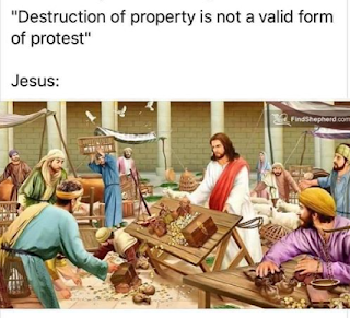 Given the context of what is happening in America today, most people will read the meme and jumpto the second agenda (regardless of what the poster actually intends): Jesus destroyed property therefore it is a legitimate form of protest that aggrieved people can participate in. If that is the subtext of the meme in most cases—and it is pretty obvious that it is—it raises more questions.