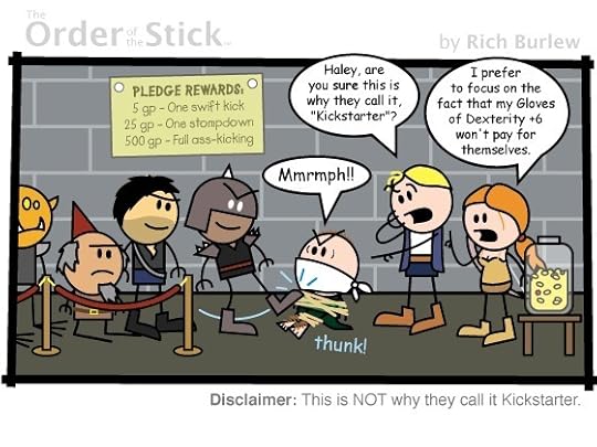 One of my favorite Web comics (and I only follow a few) recently ran a Kickstarter project hoping to raise $57,750 to reprint some collections of the comic. The Order of the Stick author/artist/genius Rich Burlew did a little better than that: the final total was $1.25 million dollars, the third biggest Kickstarter ever. You can read about it here on Publishers Weekly, among other places. Note that the majority of the money will probably go to getting the premiums printed and shipped.