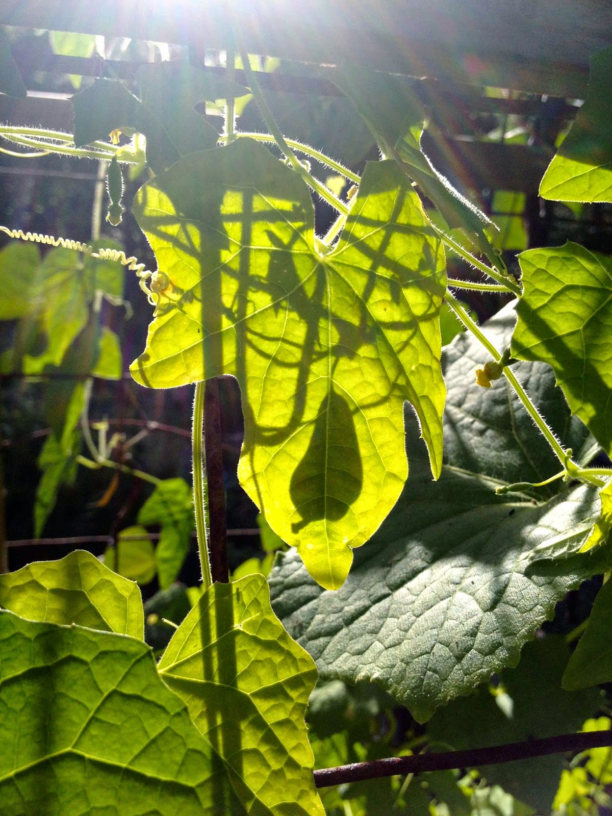 A fun view of a pear-shaped cucamelon!Can you see it? It's hiding behind the leaf - see