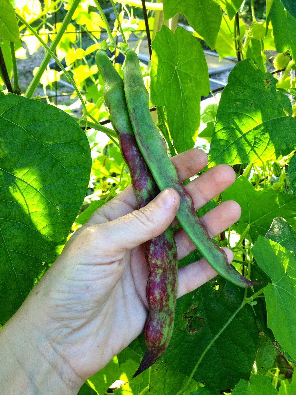 Anyhoo, tonight I was picking a handful of Mexican sour gherkin cucumbers, I stopped to notice the size of the pole bean leaves that are winding their way up the same A-frame trellis. I do remember planting a few pole bean seeds amongst the cucumbers way back in late May, but I had totally forgotten what variety I sowed and the plant tag was long smothered - somewhere - under the rampant cucumber vines that are climbing, sprawling and creeping everywhere in and around that bed. So when I actually paused to look at the vining bean foliage, I was struck by how LARGE the leaves are - at least double that of my regular pole beans. Hmmm..