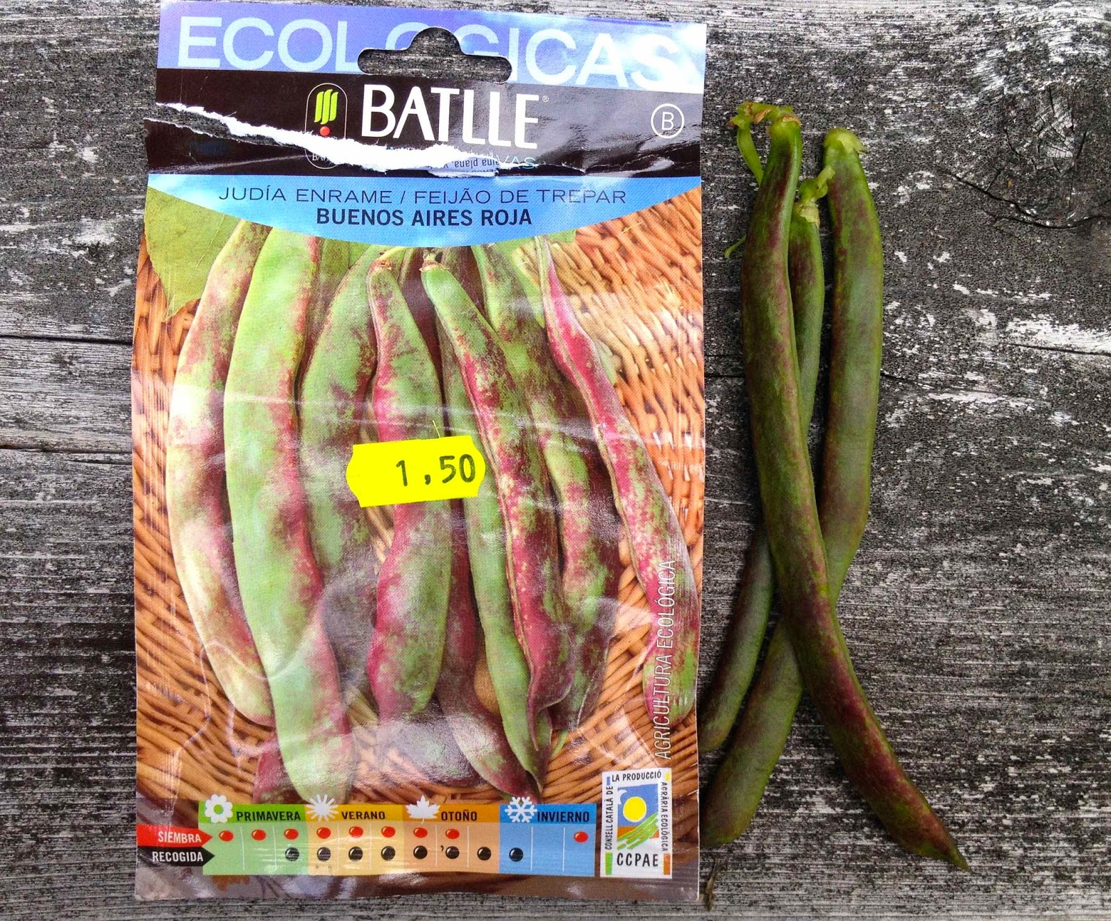 So I poked around under the foliage to see if I could see any actual beans to help me ID this sucker.. And yes, there were some pods - they were green, brushed in red! Glorious!! I immediately knew that this was 'Buenos Aires Roja', a variety sent to me from Spain. They look exactly like the seed packet - see below - and have a sublime bean-y flavour. Definitely something I will plant again. I picked these pods a bit young - they were about 5 inches in length, but according to my halting spanish translation of the packet, they will grow to 6 inches and then mature to 1 inch wide, flattened pots.