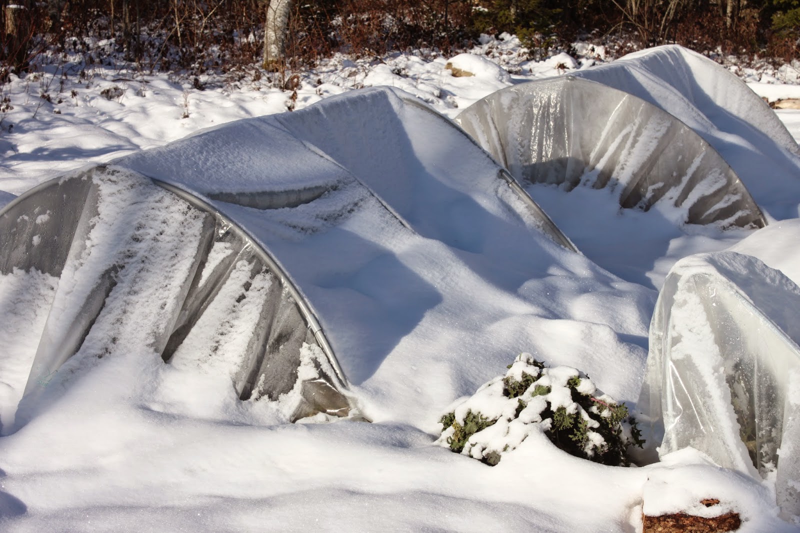 Hello winter mini hoop tunnels! Note the centresupport to help shed snow. Mini Hoop Tunnels - This handy and easy-to-make structure can be used to shelter winter crops - especially tall veggies like kale, Italian parsley, collards and leeks. Or, overwinter crops for a super early harvest by seeding cold hardy salad greens and scallions in late September - October, and covering with a mini hoop tunnel in autumn. Harvesting of overwintered crops happens as early as March. These tunnels also great for autumn frost protection. I make mine from 1/2 inch PVC conduit that is bent in a U-shape over my 4-foot wide beds. I use 1-foot long rebar stakes to secure the conduit. For winter support, run a length of wood down the centre of the structure to shed snow. If you just wish to autumn harvest, no need for the centre support. Cover with a sturdy clear plastic cover. I use 6 mil greenhouse poly. A mini hoop tunnel will lengthen the harvest season of cool and cold season crops by months