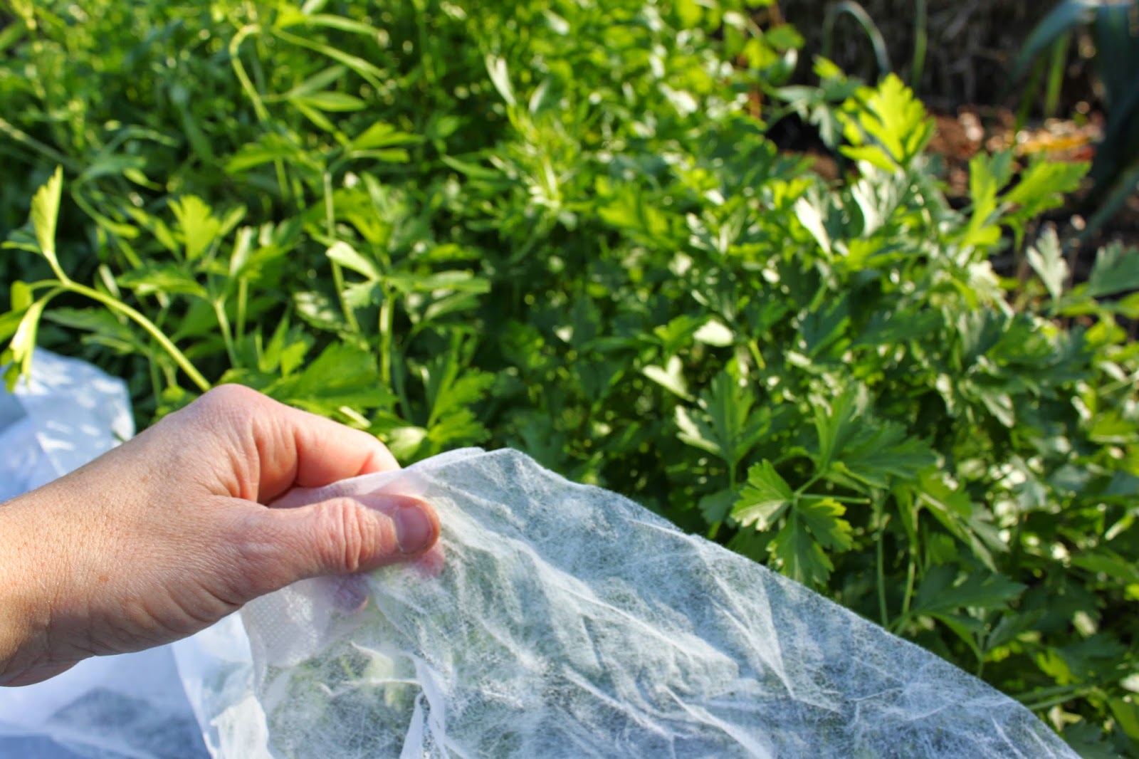 A lightweight row cover over Italian parsleyRow covers - These are a very basic level of protection, but can extend an autumn harvest by weeks or even months, depending on the crop. A row cover is simply a piece of lightweight fabric that comes in a range of sizes and weights. A lightweight row cover can be used to insulate against a light frost, while medium and heavy-weight row covers are used for more serious cold protection. Keep in mind that heavier fabrics allow less light to pass through to your crops so if you still want your crops to grow, remove the covers in the morning, replacing them at night or if a frost warning is issued.