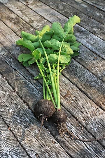 I don't think it's a secret - radishes are easy to grow. And quick! I sowed the seed for these black Spanish radishes in early July and harvested the first two yesterday.. The rough black exterior is simply gorgeous and hides a creamy white interior that packs more than a gentle bite!The bigger one in the photo was about 2 inches in diameter.. it wasn't until after I harvested that I read (on the seed packet) that I should have picked it when it was about the size of a quarter.. oops! Apparently, they have a tad less heat at that stage. Either way, this was a fun new radish for me and I'm going to sow the rest of the seed pack for an October harvest. I may even see if I can get these to 'hold' in the cold frames or garden into late autumn/winter.