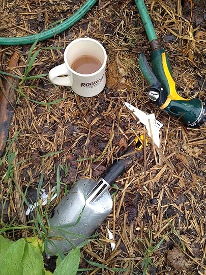 This mornings 'stuff'.. tea, hose, plant tags anda trowel.