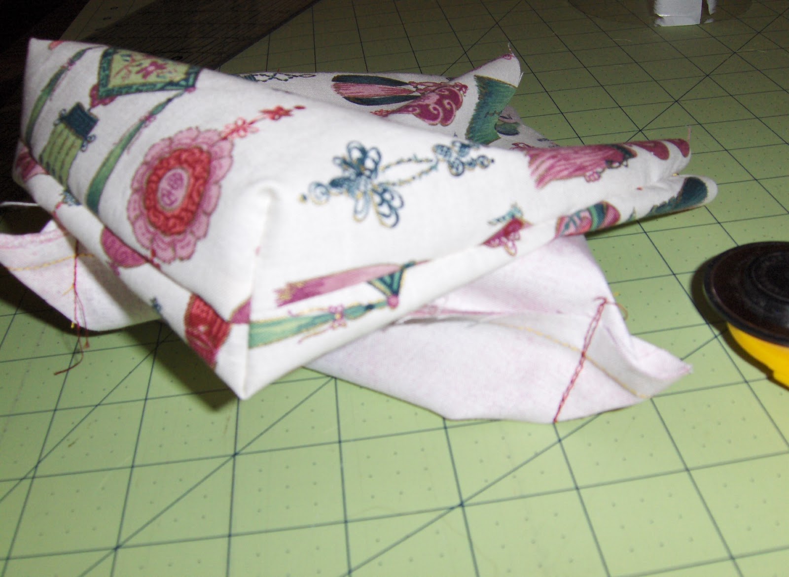 Sergers practically required the use of a serger bag although I don't recall ever really seeing one for sale. I used to use a plastic bag tucked around one of the feet. The bag caught all of the threads and excess fabric as it came off of the machine. When I joined the quilt guild, I learned to make this little bag. As a quilter, it comes in handy at the machine. I use it to catch the little threads and, sometimes, small pieces of fabric. The sand bag at the top makes a handy pincushion when I leave my pin magnet in front of the TV or on the ironing board. Tell me you've never done that?!