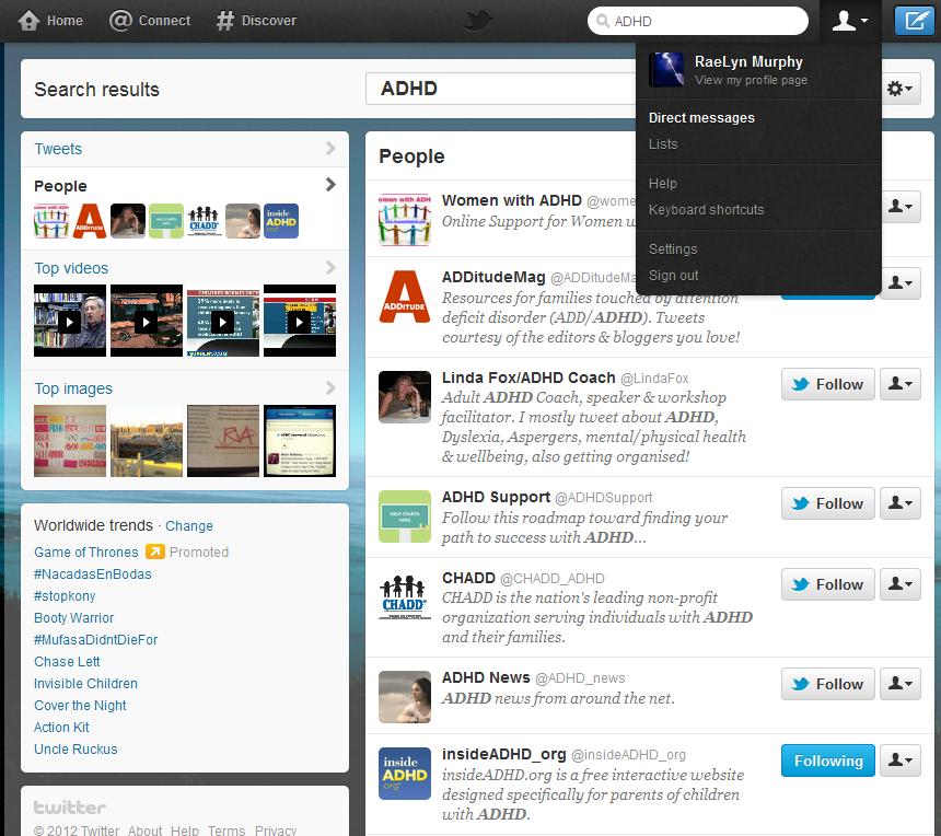 To make a list, go to the drop down menu next to your head symbol at the upper right side of the page. Below your name it says "View my Profile," "Direct Messages," and "Lists". Click on "Lists."