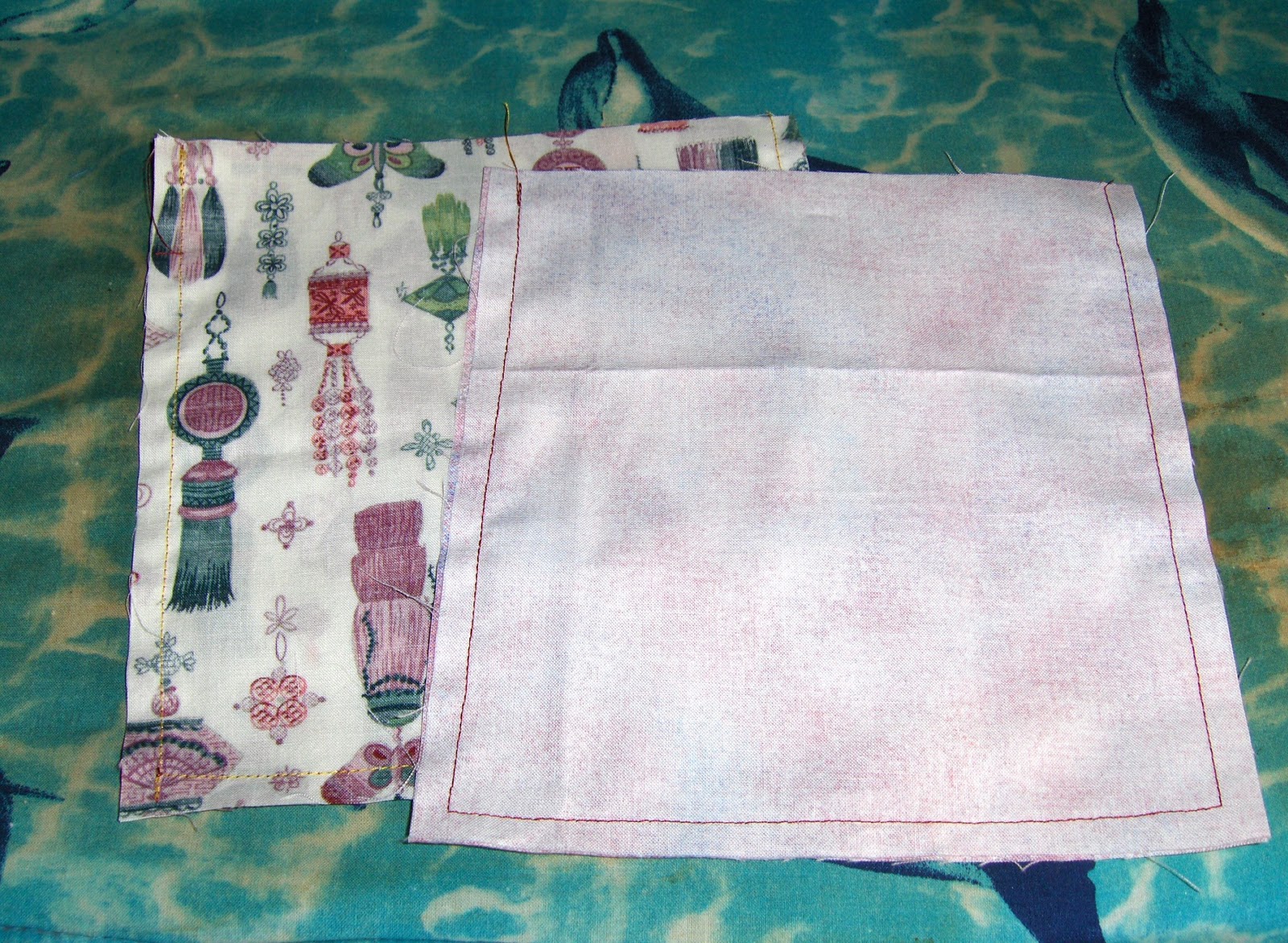 Cut two liner pieces and two outer bag pieces to your measurements. Here, my pieces are 7 1/2" x 8" each. The 7 1/2" will go around the ring, being 14" in diameter once sewn. The bag, then, is 8" deep. Sew around three sides to create a pocket, as shown.