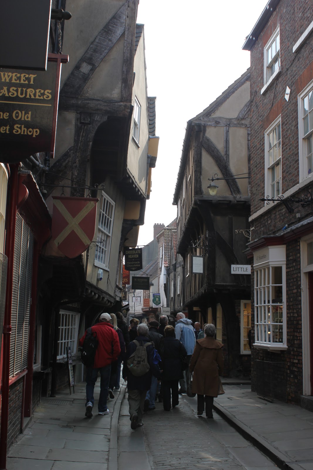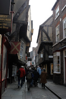 York Minster, from halfway up the tower.After Minster, we found the Shambles, which is a series of old cobblestone streets which have been blocked off from traffic. The old houses have been preserved and turned into nice shops, and you have a fairly glamorous outdoor shopping experience in the midst of hundreds of years of history. I found it strange, this combination of history and commercialism, and finally had to settle on the idea that history is something Europeans live among, because there is so much to be had of it. In comparison, our historical sites in America (especially here in the west) are so paltry and few that we memorialize them and set them apart, shrine-like. In England, they just keep living in and using the same old buildings and the same ancient walls and streets. It's one of the things I love about England.