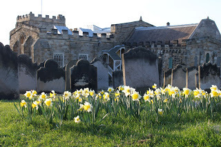 The church at the top of the hill in Whitby. The daffodils!