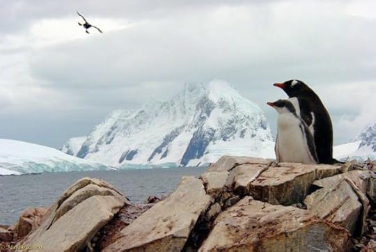 Marty’s photo of the day #2706: Here’s a nice scenic photo, I took on an Antarctica island. The gentoo penguins cooperated nicely for this shot. A south polar skua provides the photobomb.