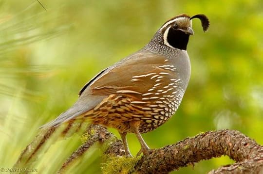 Q is for Quail. This California quail lives near my house. Of all the birds that live near me, these are the most exotic-looking. I’d expect to see a bird like this in New Guinea, not Montana. Although quail fly quite well, they are reluctant flyers and will often run away when panicked.
