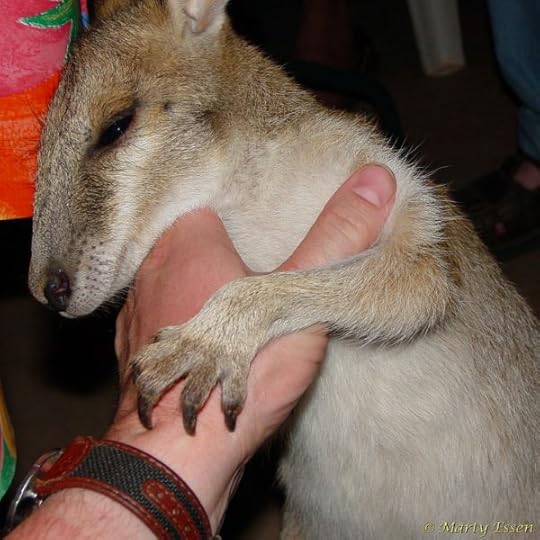 W is for Wallaby. Wallabies are small-to-medium sized kangaroos—members of the Macropodidae family. The wallaby in this photo is Herbie, an adolescent agile wallaby who had lost his mother. One of the signs that Herbie was almost ready to be released into the wild was his desire to spar with people as he would have sparred with wallabies in the wild. Sometimes he’d let me hold or pet him; other times he’d slap my hands or grab them with his sharp nails. Though he scratched me several times, the temporary discomfort was a small price to pay for the unique experience of sparring with a wallaby.