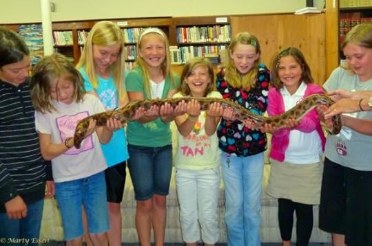 Marty’s photo of the day #2583: I was flipping through my photo files this morning, trying to decide what to post, when I came across this shot. Several years ago, I helped with an after school program at the Stevensville, Montana library. The kids are holding Eve, my seven-foot-long rainbow boa. Most were touching a snake for the very first time and were surprised that Eve wasn’t scary or slimy. Instead, she was friendly, warm, and dry. Eve and I need to get out and do events like this more often.