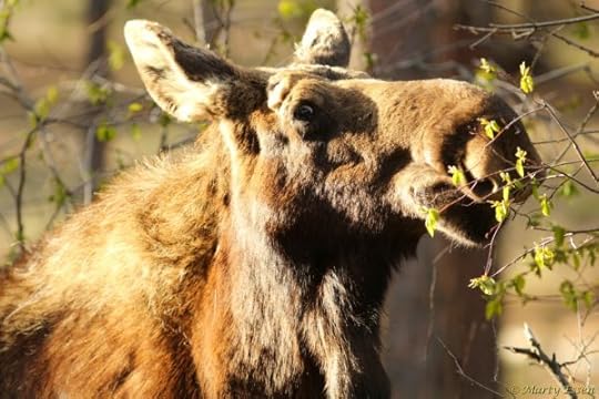 Marty’s photo of the day #2512: I love the feeling this photo projects. Mr. Moose can’t pass up stripping the branch of its tasty new growth, yet he can’t take his eye off of me either. And you can tell by the aim of his eye just how much he towers over me.