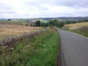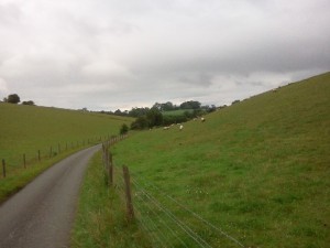 I stop at the top and look over the rusty guardrail, down some fifteen hundred feet, to the green east-west valley I will soon traverse. Far in the southern distance rise the next hills, lost in the mist and the perfume of meadows and the distant sea. The only sounds are the wind and the bleating of sheep. The occasional car passes with an apologetic slowness, like people entering a chapel or some sacred grove.