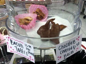 It’s wacky Wednesday and nothing comes wackier than chocolate covered bacon. I consider myself an affectionado of a food item that along with flour, beans and brown sugar, kept people alive when they wagon-ho’d to the Wild West. You could say our country was founded on bacon. It’s a national treasure, like the bald eagle.