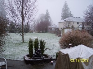 My calendar says it's the first day of Spring, but the weather outside says otherwise. It snowed yesterday. Check out the photo on the right—that was taken just the other day. I think Mother Nature forgot it's supposed to be warming up around here. Today, it's pseudo sunny (meaning, it's not raining), but it's cold, cold, cold.